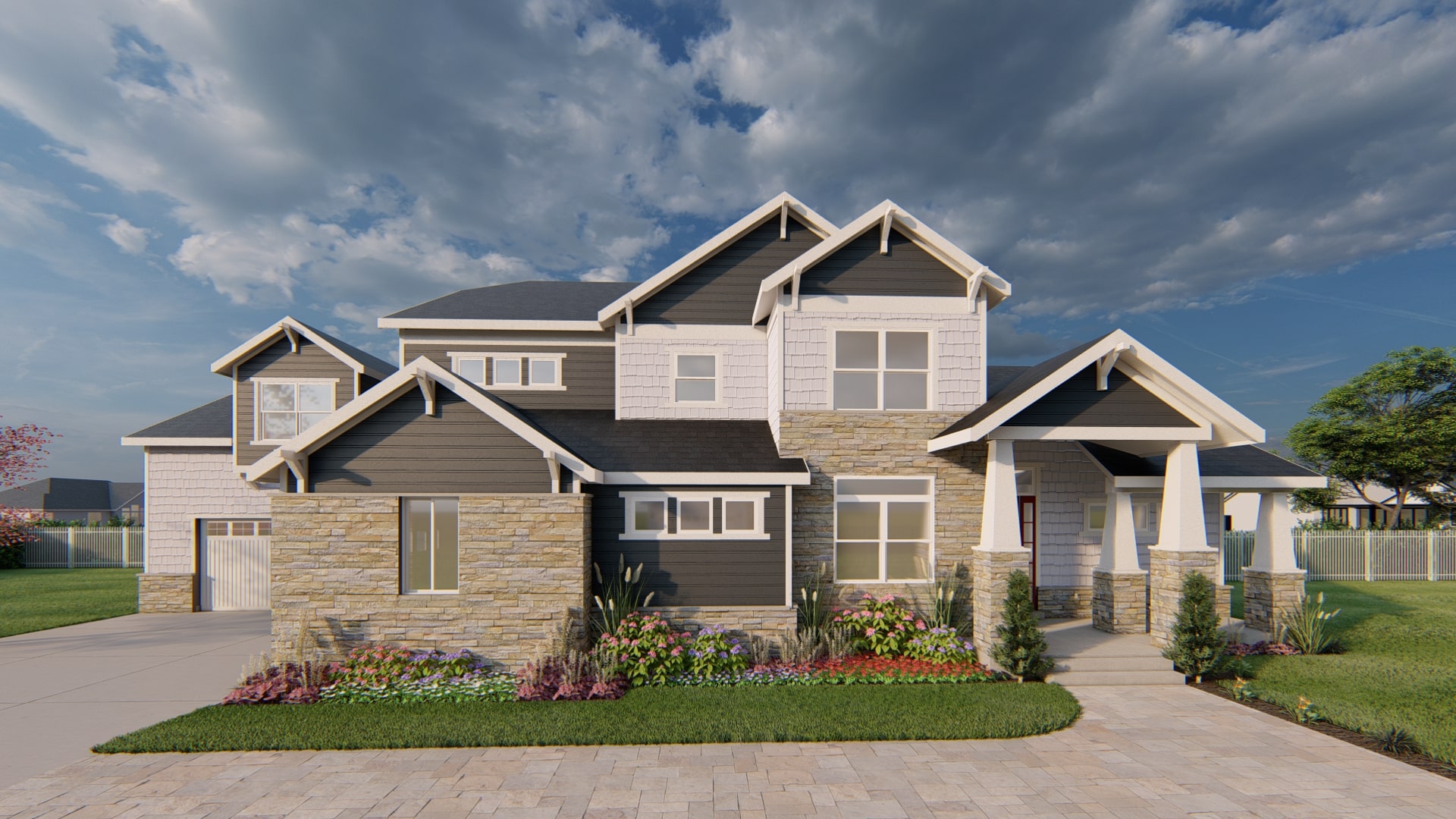 The Arcadia is a large two-story house plan with lots of optional bonus space. The main level features an open concept kitchen and great room, the master bedroom suite with a large bathroom, a study and a mudroom off of the 3 car garage. The upper level has 3 bedrooms, two bathrooms, the laundry room, a loft open to the great room below and optional bonus space for a playroom above the garage. The lower level has space for an additional family room, bedrooms, cold storage and pre-cast space under the garage that can be used as a theater. The Arcadia is shown here in a craftsman style elevation, but can be purchased in other exterior style options.